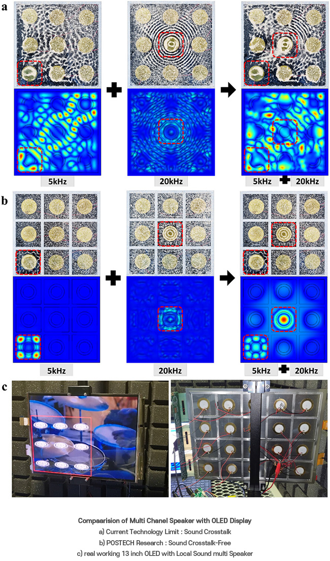 Учёные Пхоханского университета науки и технологии (POSTECH, Южная Корея) продемонстрировали OLED-панель с «локальным звуком на основе пикселей» — звук воспроизводится непосредственно с поверхности дисплея. Прототип имеет размер 13 дюймов, что сопоставимо с экранами планшетов и ноутбуков. Каждый пиксель такого дисплея может действовать в качестве отдельного динамика, благодаря чему создаётся многоканальный массив без внешних драйверов.