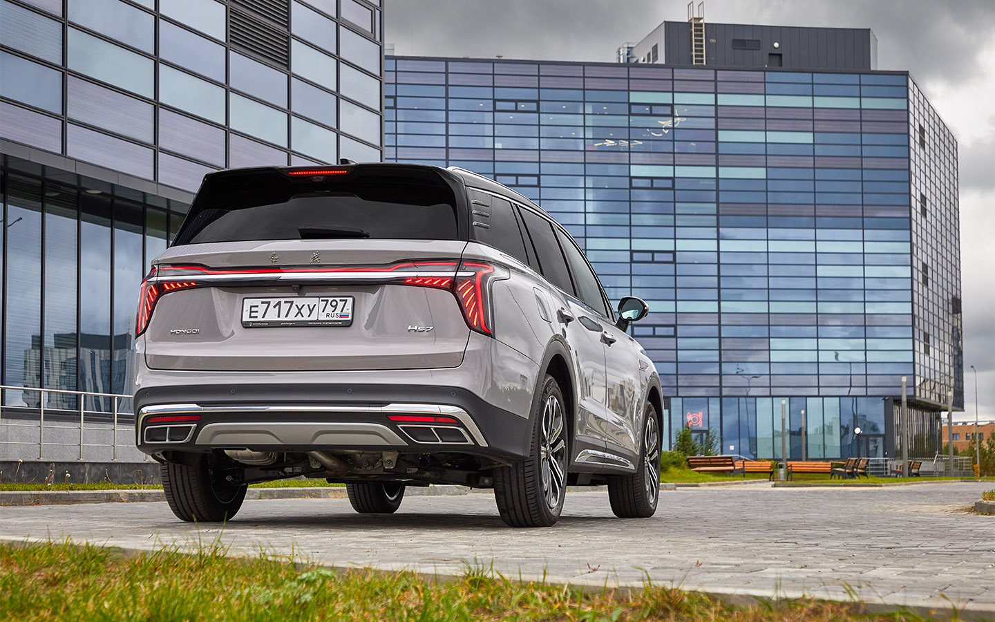 Hongqi HS7 не кичится статусом: опознать автомобиль в потоке при взгляде сзади можно в основном лишь по паре иероглифов на крышке багажника(Фото: Hongqi)С завода у Hongqi HS7 есть металлические рейлинги, что несомненный плюс, а вот установить фаркоп, увы, нельзя: в ОТТС такая опция не предусмотрена (Фото: Hongqi)По габаритам Hongqi HS7 близок к таким гигантам, как Cadillac Escalade или BMW X7, но автомобиль не выглядит громадным(Фото: Hongqi)Клиренса в 20 см Hongqi HS7 вполне хватает для преодоления легкого бездорожья, но на большее автомобиль изначально не рассчитан(Фото: Hongqi)Все Hongqi HS7 комплектуются 20-дюймовыми колесами, дизайнов дисков — два (Фото: Hongqi)Отрадно, что на Hongqi HS7 с завода ставят высококачественные шины Michelin Pilot Sport размерности 235/55(Фото: Hongqi)Двухуровневая оптика с отдельными противотуманками на Hongqi HS7 — грамотное решение, но зимой и в слякоть фары будут быстро загрязняться; омывателей нет(Фото: Hongqi)Передний и задний подрамники на Hongqi HS7 выполнены из алюминия, сзади — независимая подвеска на стальных рычагах(Фото: Hongqi)Без красного логотипа-знамени образ Hongqi HS7 был бы неполным. Росчерки пера британца Джайлса Тейлора, работавшего прежде над моделями Rolls-Royce, заметны повсеместно(Фото: Hongqi)