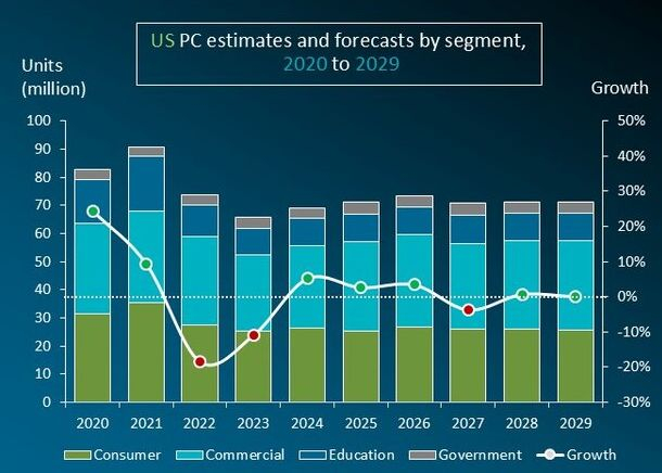 Как отмечают авторы исследования, в коммерческом сегменте рынка ПК в США использование платформ, адаптированных для работы с ИИ, за последние два года более чем удвоилось, и только в текущем продемонстрировало рост на 50 %. В потребительском сегменте экономические трудности с высокой вероятностью снизят спрос на ПК на американском рынке в оставшееся до конца года время, по мнению аналитиков. По сути, если коммерческий сегмент ПК по итогам года вырастет на 8,3 %, то в потребительском будет наблюдаться снижение на 3,9 %. Примечательно, что правительственные клиенты закупят в США по итогам текущего года на 9,9 % больше ПК, чем в прошлом году. Образовательный сектор подрастёт от силы на 0,3 % в текущем году, а в следующем и вовсе просядет на 1,9 %. В совокупности, все категории клиентов в текущем году купят 71,040 млн настольных ПК и ноутбуков, что превысит прошлогодний результат на 2,6 %. В следующем году прирост достигнет 3,5 %, а вот по итогам 2027 года может наблюдаться снижение на 3,7 % до 70,793 млн проданных ПК и ноутбуков.