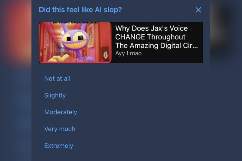 В марте 2026 года система начала предлагать пользователям опросы, в которых их просят оставлять отзывы о видео и оценивать, относятся ли эти материалы к категории ИИ-бурды. Об этом люди стали сообщать на платформах Reddit и X — они публикуют снимки экрана, на которых предлагается дать оценку, «похоже ли это на ИИ-бурду». Пользователь может выбрать один из пяти ответов: «совсем нет», «немного», «умеренно», «очень сильно» и «крайне».